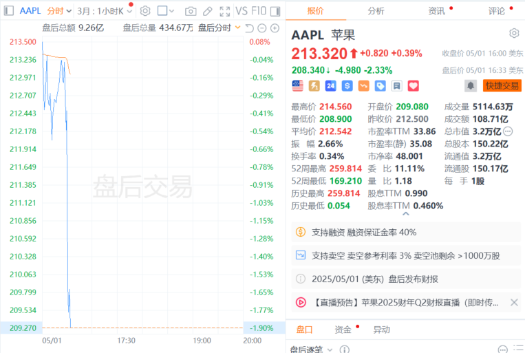 财联社5月2日电,苹果美股盘后跌超2%。公司第二季度大中华营收160亿美元,预估168.3亿美元;第二季度服务收入266.5亿美元,预估267.2亿美元;第二季度IPHONE收入468.4亿美元,预估459.4亿美元。