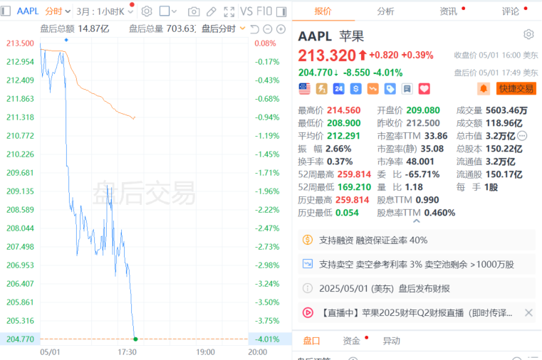 苹果股价盘后跌幅扩大至4%
