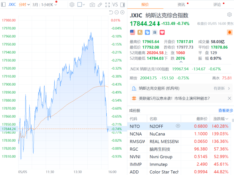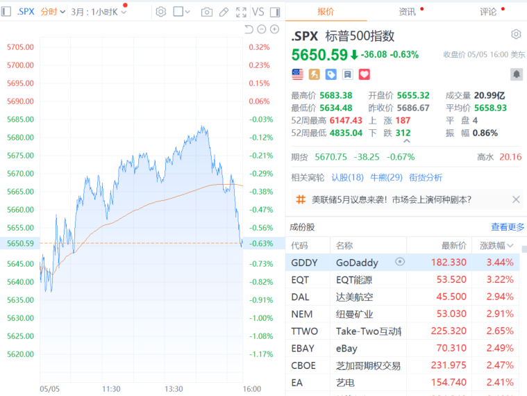 财联社5月6日电,美股三大指数集体收跌,纳指跌0.74%,标普500指数跌0.63%,道指跌0.24%。大型科技股多数下跌,苹果跌超3%,特斯拉跌逾2%,亚马逊、奈飞、英特尔跌超1%,英伟达小幅下跌;微软、谷歌、Meta小幅上涨。伯克希尔-A跌近5%,巴菲特将于2025年底卸任首席执行官一职。