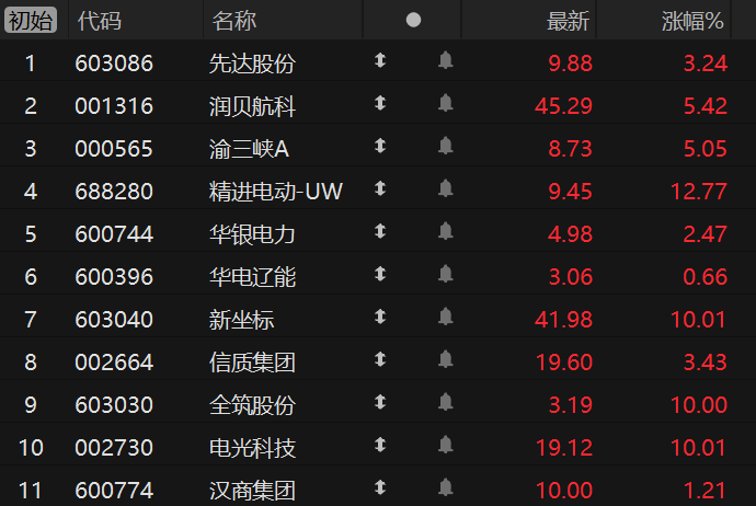财联社5月7日电,市场焦点股先达股份(9天6板)高开3.24%,业绩超预期的润贝航科(11天6板)高开5.42%、渝三峡A(5板)高开5.05%、精进电动(科创板3板)高开12.77%,电力股华银电力(6天4板)高开2.47%、华电辽能(5天3板)高开0.66%,机器人板块新坐标(3板)竞价涨停、信质集团(2板)高开3.43%,算力板块全筑股份(3板)竞价涨停、电光科技(2板)竞价涨停,零售+医美的汉商集团(3板)高开1.21%。