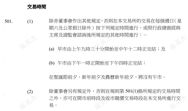 下一集,我们将正式开启交易规则的讲解。按照“联交所规则-章数五 交易”的条款顺序,我们把规则讲解第一集的篇幅交给——交易时间。