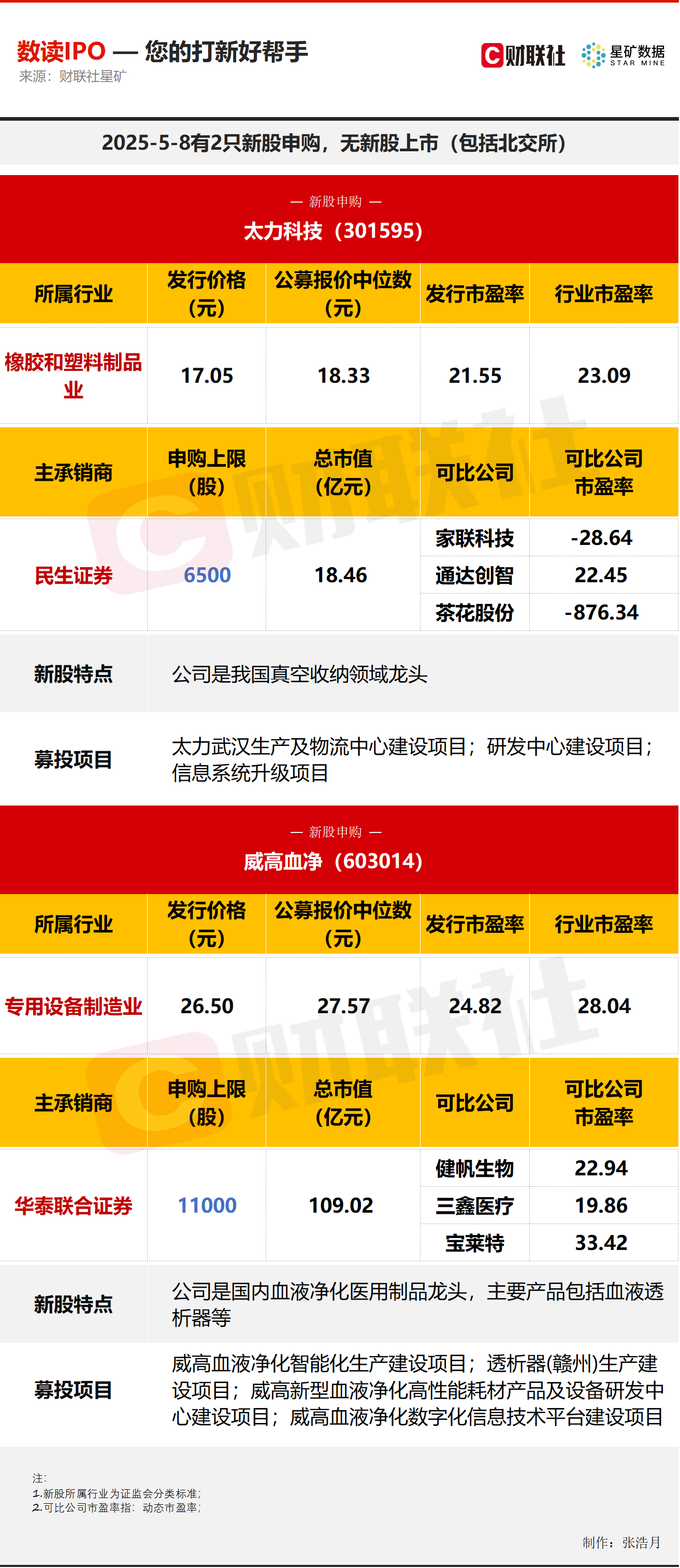 财联社5月8日电,今日有2只新股申购,分别为创业板的太力科技,沪市主板的威高血净;无新股上市。