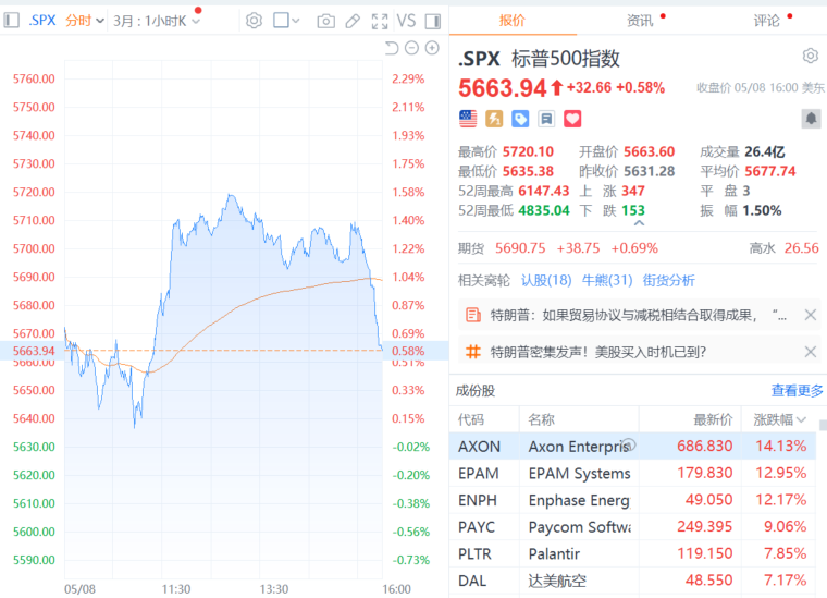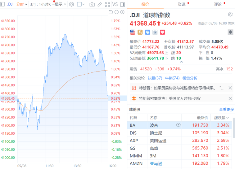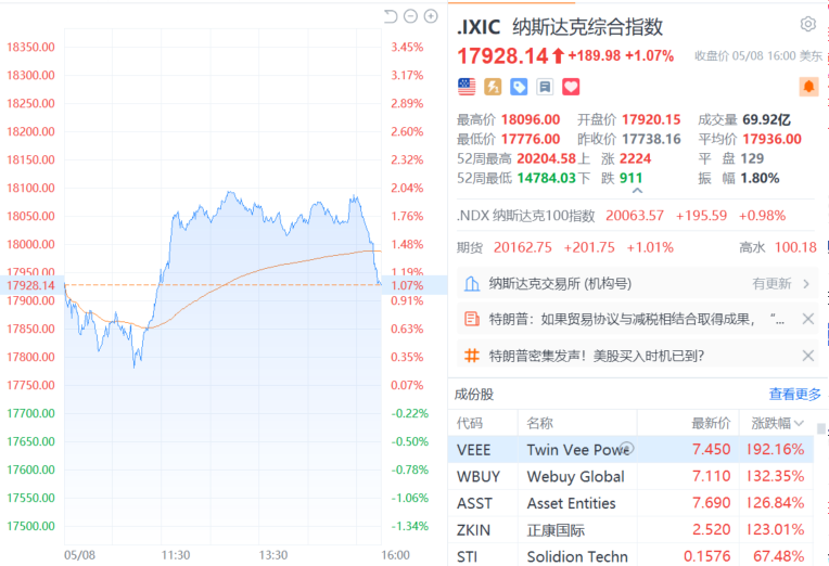 财联社5月9日电,美股三大指数集体收涨。纳指涨1.07%,道指涨0.62%,标普500指数涨0.58%。大型科技股普涨,特斯拉、英特尔涨超3%,亚马逊、谷歌、微软涨超1%,英伟达、Meta小幅上涨;奈飞跌约1%。ARM跌超6%,公司业绩指引逊于预期。诺瓦瓦克斯医药涨约12%,公司发布高于预期的2025财年销售指导。QBTS涨超51%,创2023年5月份以来最佳单日表现,并领跑一众量子计算概念股。