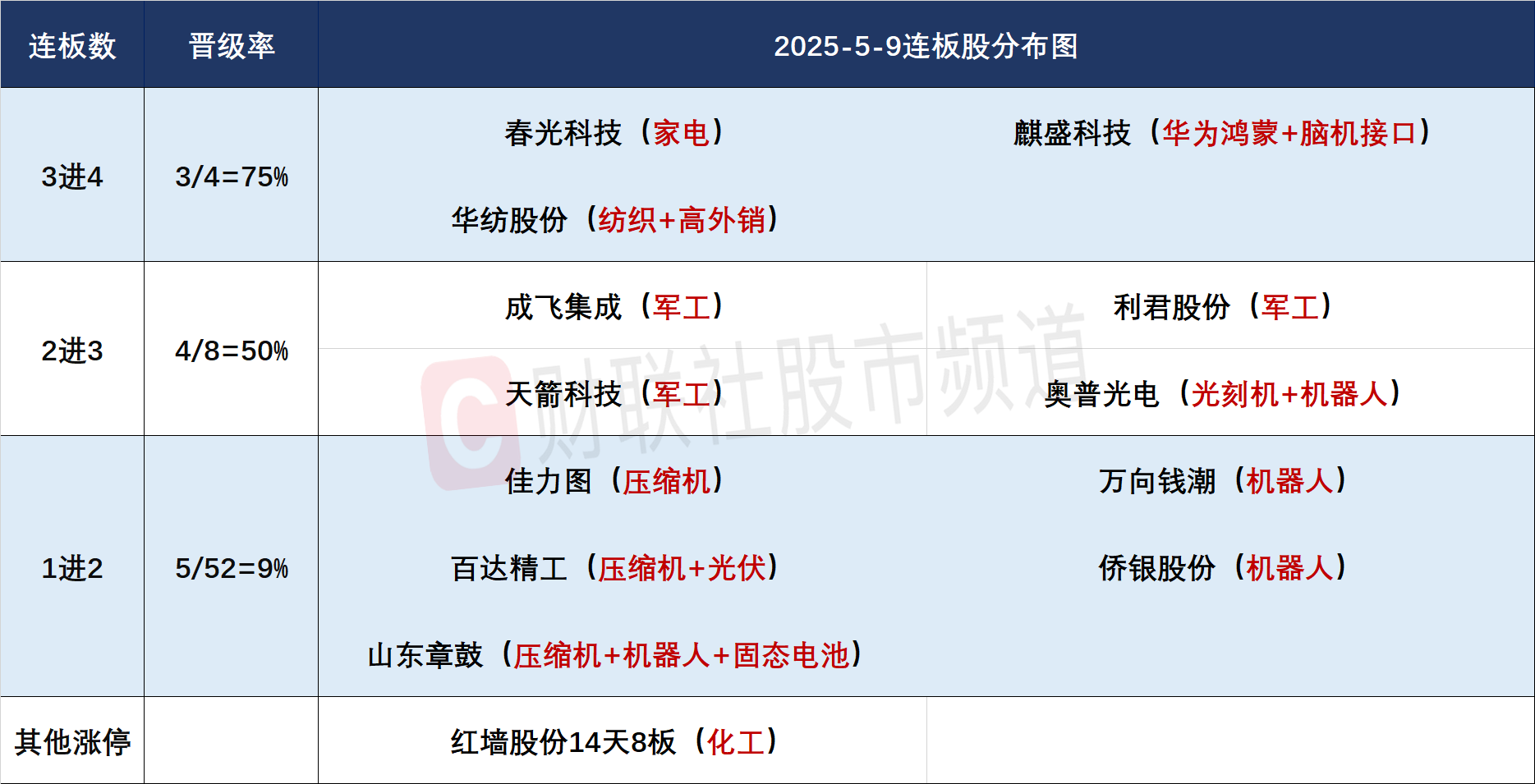 今日共33股涨停,连板股总数12只,其中三连板及以上个股7只,上一交易日共14只连板股,连板股晋级率50%(不含ST股、退市股)。个股方面,全市场超4000只个股下跌,多数高位股持续负反馈,亏钱效应加大,中毅达一字跌停,中超控股、润贝航科炸板翻绿,精进电动连续第二个交易日跌超10%。板块方面,华纺股份超预期4连板带动纺织股走强,万事利、远信工业20CM涨停,迎丰股份、苏州龙杰、宏达高科等个股涨停;军工板块在连续上涨后如期分化,成飞集成、天箭科技、利君股份晋级3连板,但板块中军中航成飞早盘冲高后大幅回落,最终收跌近4%,爱乐达、晶品特装等个股也跌超7%。