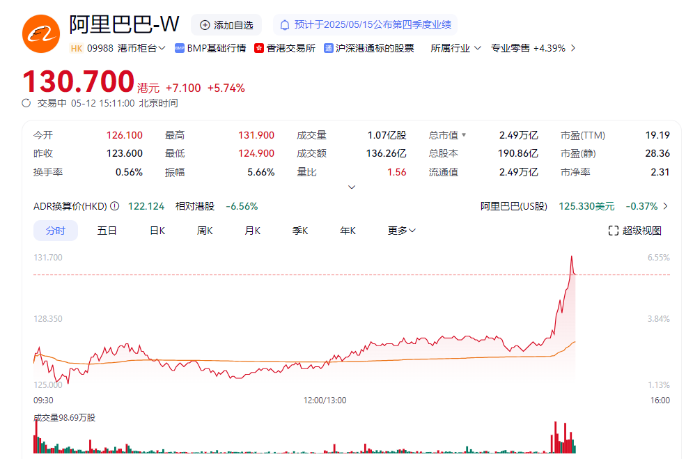 财联社5月12日电,科网港股巨头午后涨幅扩大同时成交放大。截至发稿,阿里巴巴-W(09988.HK)涨5%,京东集团(09618.HK)涨5%,腾讯控股(00700.HK)涨4%。