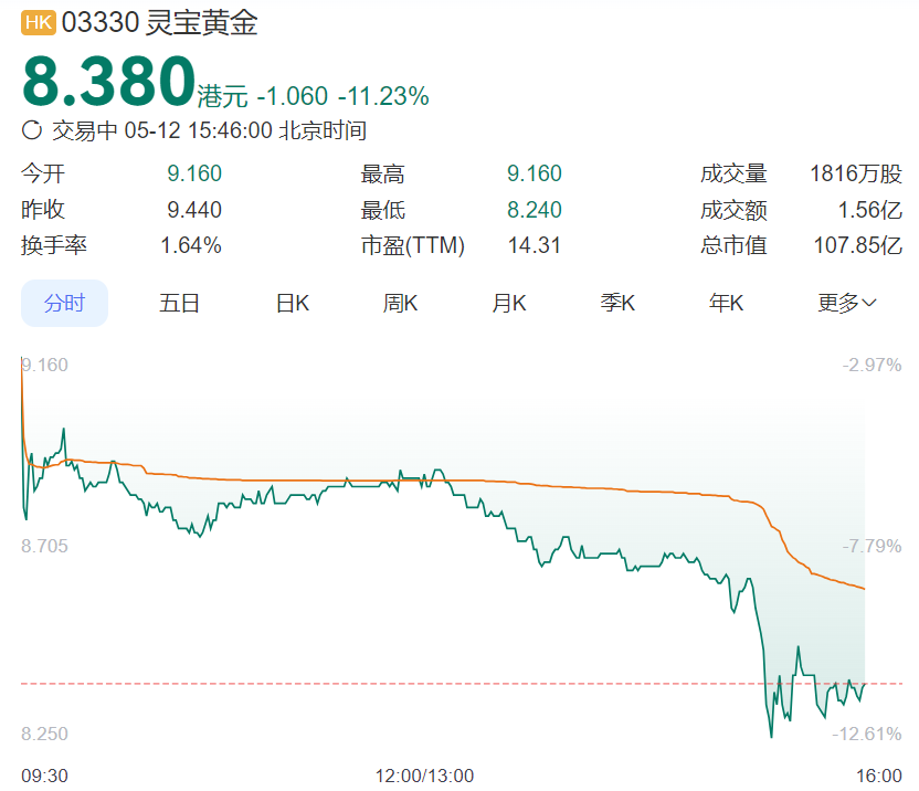黄金概念港股随金价下挫 灵宝黄金跌11%