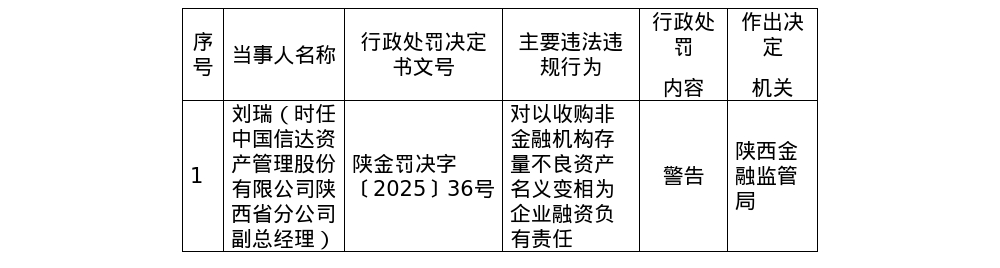 ①时任中国信达陕西分公司副总经理刘瑞被陕西金融监管局警告; ②主要违法违规事实是以收购非金融机构存量不良资产名义变相为企业融资。