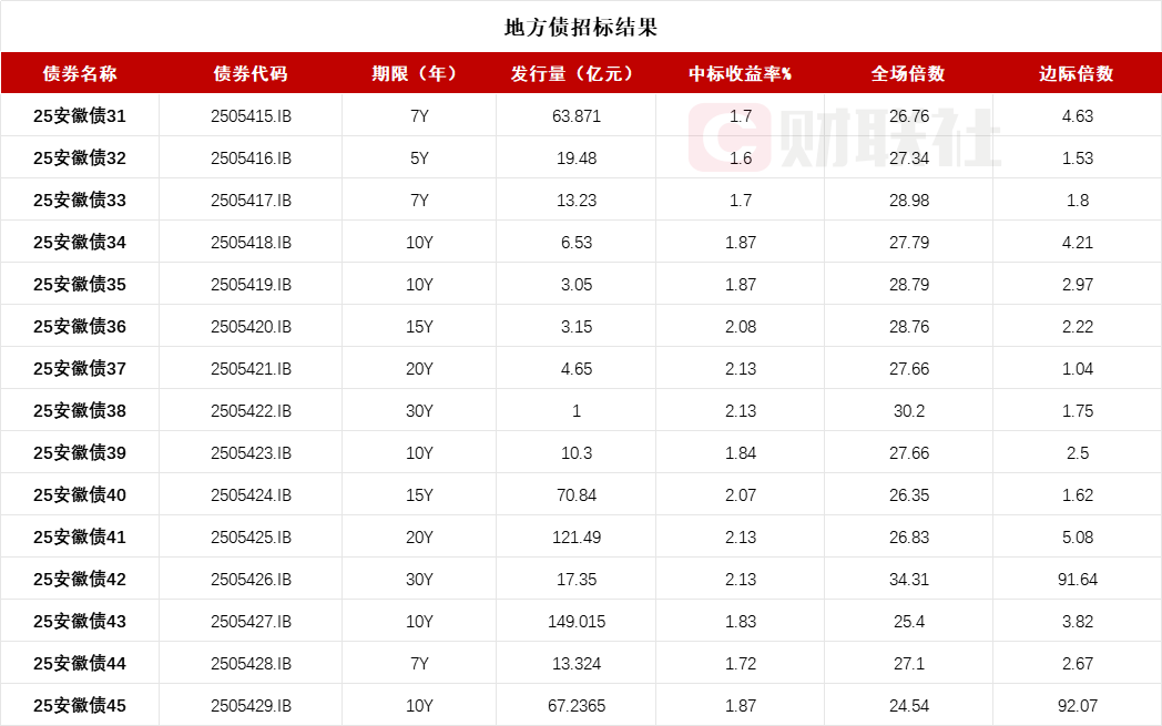 财联社5月16电,从银行间市场获悉,安徽省政府十五期地方债已招标结束,投标倍数均在24倍之上,具体中标信息如下:
