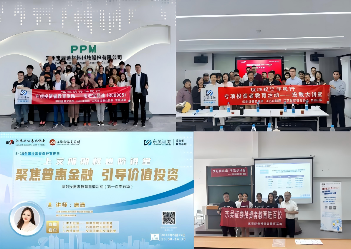 为了帮助投资者树立理性投资理念,促进上市公司提升投资者关系管理水平,推动形成良性互动的市场生态,5月7日至9日期间,东吴证券联合深交所成功举办了“理性投资伴我行”专项投资者教育系列活动。通过带领投资者走进上市公司宝丽迪、苏州大学、东吴证券投资者教育基地、东亭街道社区等形式,对不同人群有针对性地开展投资者教育宣传。活动现场气氛活跃,投资者收获满满。