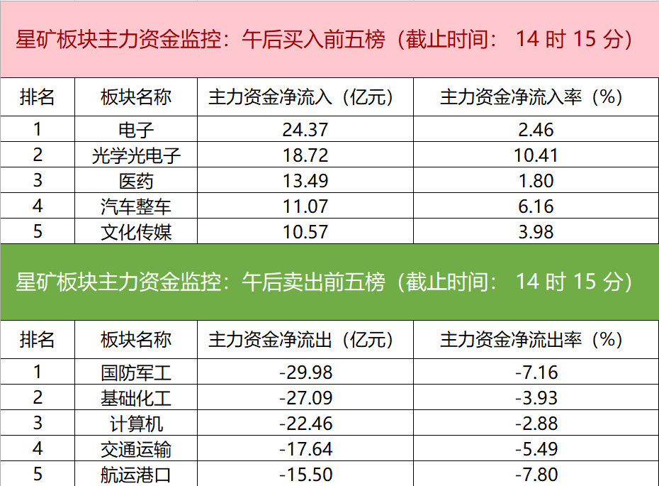 财联社5月20日电,财联社星矿数据显示,今日主力资金净流入电子、光学光电子、医药等板块,净流出国防军工、基础化工、计算机等板块,其中国防军工板块净流出超29亿元。个股方面,欧菲光涨停,主力资金净买入15.46亿元位居首位,贝因美、梦网科技、奥飞娱乐主力资金净流入居前;宁波海运遭净卖出超4亿元位居首位,利君股份、成飞集成、中毅达主力资金净流出额居前。