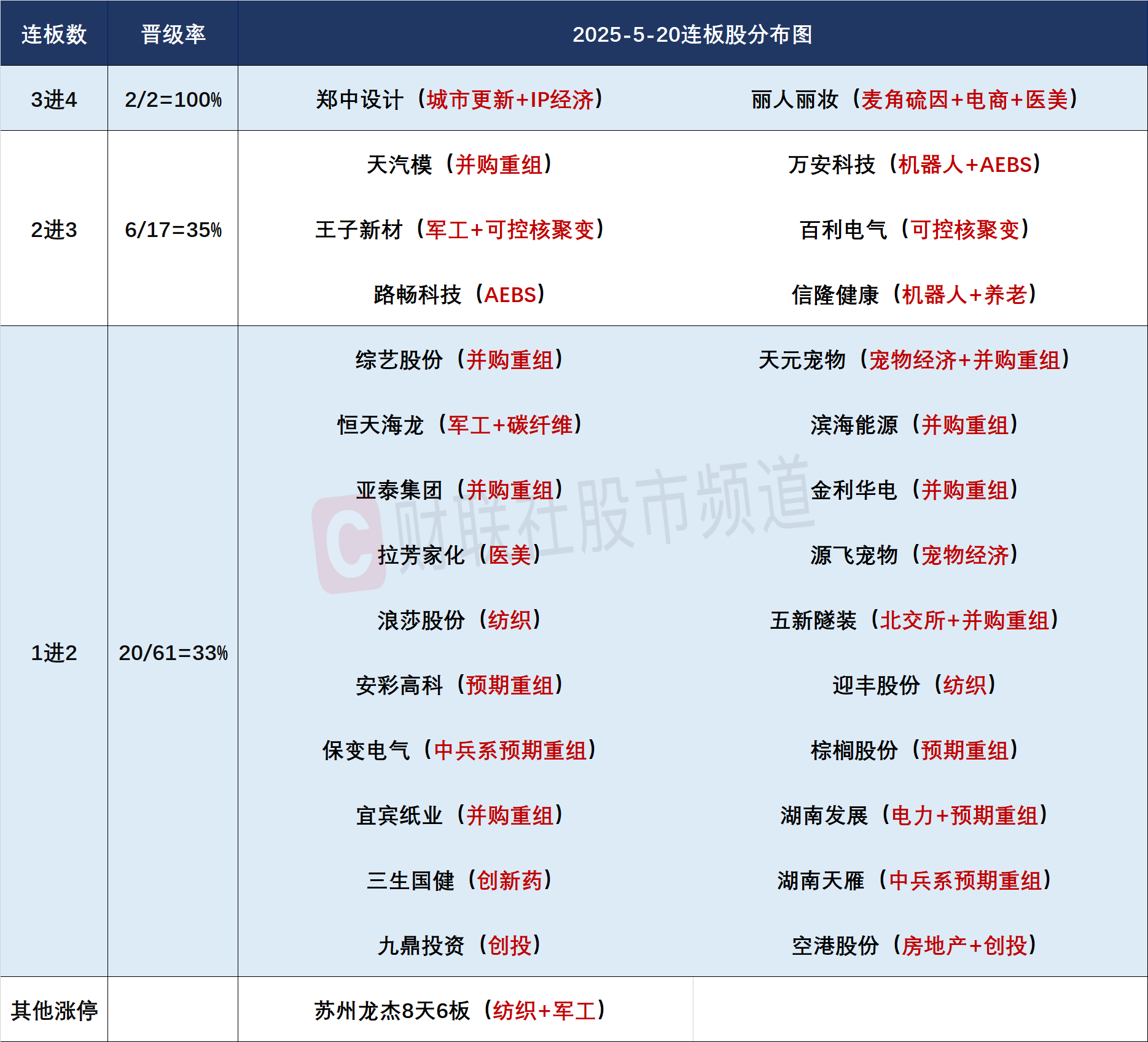 今日共77股涨停,连板股总数28只,其中三连板及以上个股8只,上一交易日共23只连板股,连板股晋级率34.78%(不含ST股、退市股)。个股方面,全市场超3800只个股上涨,连续第二个交易日逾百股涨超9%,小盘股备受青睐,北证50、微盘股指数均创历史新高。高位股开始退潮,利君股份、渝三峡A、红墙股份、尤夫股份等人气股跌停,成飞集成断板,市场连板高度被压缩至4板。板块方面,以谷子经济、宠物经济、医美为代表的新消费板块全天表现强势,其中郑中设计、丽人丽妆4连板,拉芳家化6天4板,天元宠物20CM2连板;并购重组概念依旧受到热捧,综艺股份5天4板,天汽模3连板,北交所五新隧装30CM2连板。