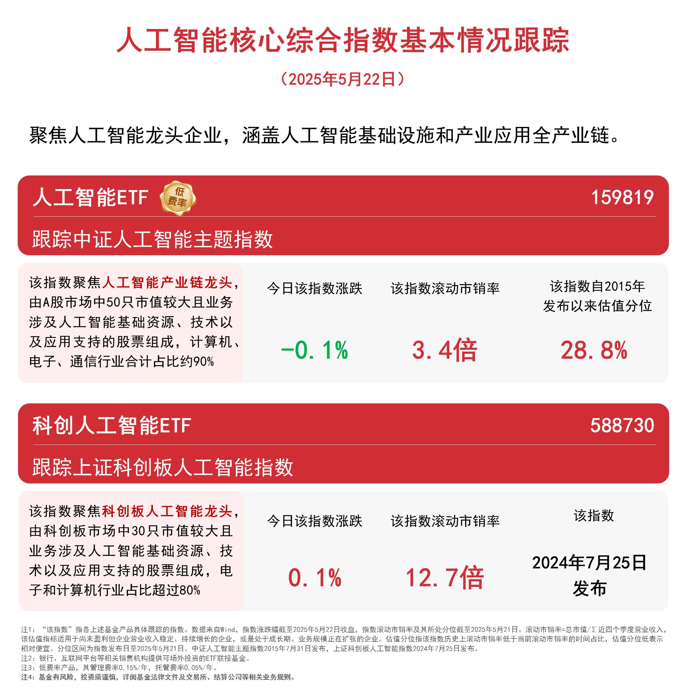 截至收盘,上证科创板人工智能指数上涨0.1%,中证人工智能主题指数下跌0.1%。Wind数据显示,科创人工智能ETF(588730)、人工智能ETF(159819)昨日分别获2600万元和1800万元资金加仓。