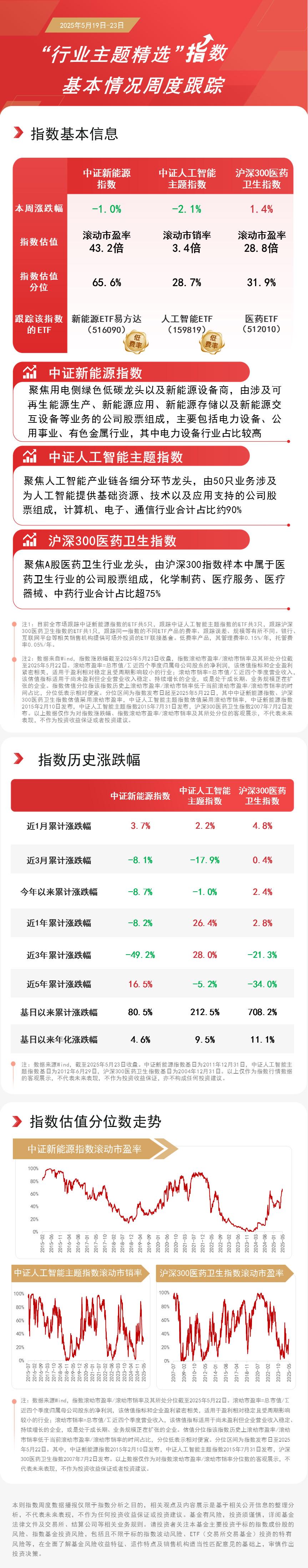 本周沪深300医药卫生指数上涨1.4%,中证新能源指数下跌1.0%,中证人工智能主题指数下跌2.1%。