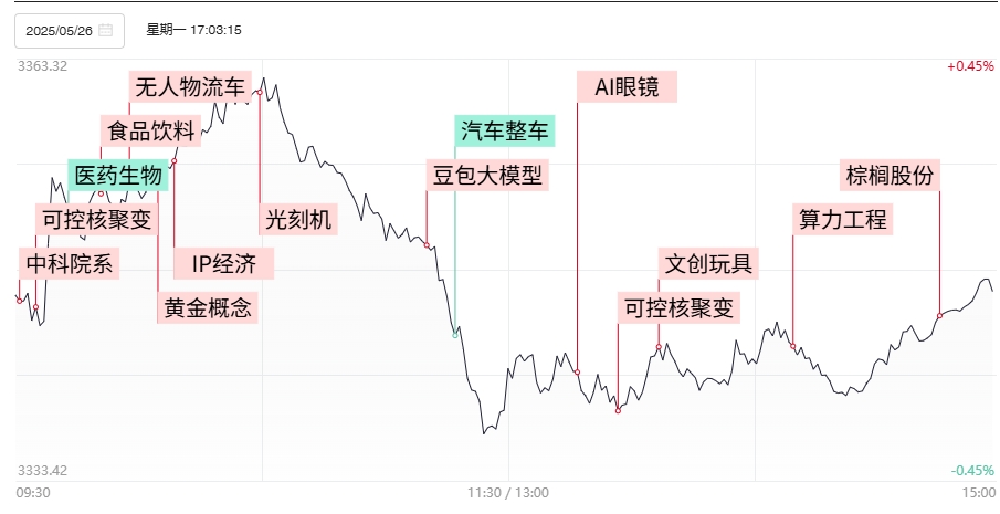 财联社5月27日电,市场全天震荡调整,创业板指领跌,宁德时代跌超4%。个股涨多跌少,全市场超3700只个股上涨。沪深两市全天成交额1.01万亿,较上周五缩量1456亿。1)近期可控核聚变以及核电产业链迎来密集催化,瑞奇智造、哈焊华通在内的多只成分股创出历史新高。在港股中核国际午后一度飙升超180%的刺激下,中核科技、中广核技在内的十余股涨停。不过后排股迎来批量补涨之际,王子新材、中洲特材等此前资金深度抱团的人气股尾盘却从日内高点跳水大幅回落,高位股内部调整压力加大意味着板块内部大分歧的临近。2)受到Labubu 3.0系列4月美国及欧洲市场销售同比增长约8倍和5倍的消息刺激,IP龙头泡泡玛特总市值盘中一度突破3000亿港币。IP经济概念持续站上风口,人气龙头京华激光分歧转一致走出5天4板,实丰文化、奥飞娱乐等大批成分股跟进纷纷位居涨幅前列。除去IP经济概念的大放异彩外,食品饮料、保健品、宠物经济等新消费分支均表现回暖,会稽山、乐惠国际、来伊份、诺普信等多股先后涨停。3)字节跳动豆包AI上线实时视频通话功能。豆包AI概念受此消息刺激逆势拉升,进而带动AI眼镜在内的整个端侧硬件股走强,会畅通讯、星宸科技涨停,润欣科技、雷神科技、博通集成、天键科技等多股涨超5%。4)全国多地加速部署无人配送。上周一度崛起的无人物流车概念卷土重来,中邮科技、云内动力、智莱科技等多只成分股实现反包涨停。