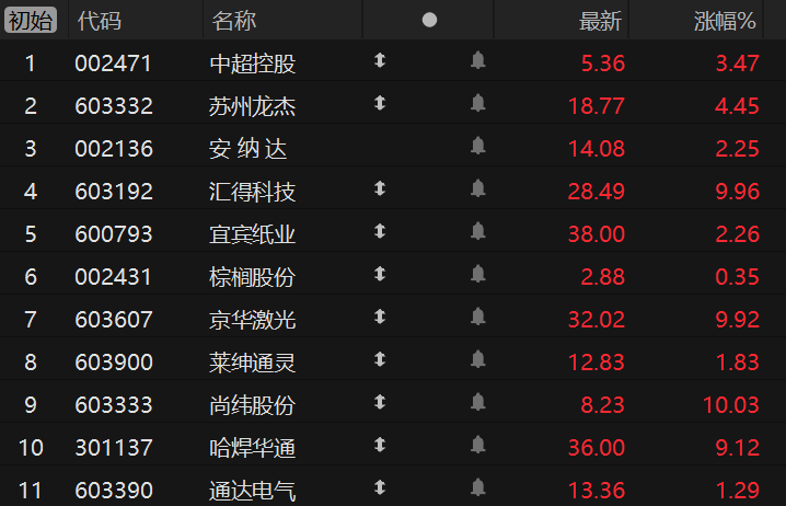 财联社5月27日电,市场焦点股中超控股(16天10板)高开3.47%,化工股苏州龙杰(12天8板)高开4.45%、安纳达(9天5板)高开2.25%、汇得科技(4板)高开9.96%,并购重组的宜宾纸业(6天5板)高开2.26%、棕榈股份(6天5板)高开0.35%,IP经济概念股京华激光(5天4板)高开9.92%、莱绅通灵(5天4板)高开1.83%,核电板块尚纬股份(3板)竞价涨停、哈焊华通(创业板2板)高开9.12%,无人物流车概念股通达电气(4天3板)高开1.29%。