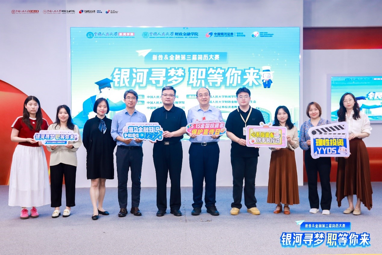 毕业季,各位学子即将踏入广阔的就业天地。简历是个人形象的“名片”,也是开启“理想岗位”的钥匙。5月21日下午,“银河寻梦,职等你来”新传x金融第三届简历大赛在中国人民大学新闻学院演播厅举行。本次活动由中国人大新闻学院、财政金融学院、中国银河证券联合主办,由中国人大新闻学院、财政金融学院研究生会和银河证券投教基地共同承办,旨在搭建培养高素质人才、促进高质量就业的平台,为学生提供拓宽就业选择、展现个人风采的机会。中国人民大学新闻学院党委副书记、纪委书记王宝奎、中国银河证券财富运管总部副总经理邸柱等出席。