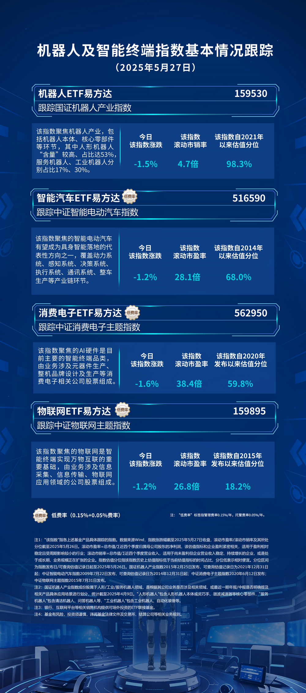 截至收盘,国证机器人产业指数下跌1.5%,中证智能电动汽车指数下跌1.2%,中证消费电子主题指数下跌1.6%,中证物联网主题指数下跌1.2%。Wind数据显示,截至昨日,机器人ETF易方达(159530)连续6个交易日获资金加码,最新规模突破15亿元,再次创下新高。