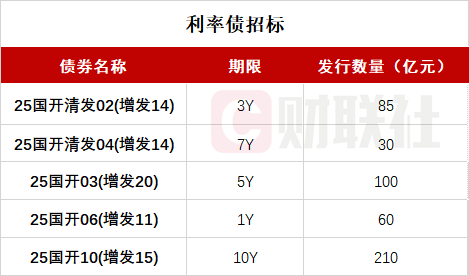 财联社5月29日电,按照此前公布的发行计划,国家开发银行将于09:30-10:30、14:30-15:30分别招标发行五期金融债:国家开发银行2025年在上海清算所第二期金融债券(第十四次增发),期限3年,发行量不超过85亿元,票面利率1.47%;国家开发银行2025年在上海清算所第四期金融债券(第十四次增发),期限7年,发行量不超过30亿元,票面利率1.6%;国家开发银行2025年第六期金融债券(第十一次增发),期限1年,发行量不超过60亿元,票面利率1.54%;国家开发银行2025年第三期金融债券(第二十次增发),期限5年,发行量不超过100亿元,票面利率1.27%;国家开发银行2025年第十期金融债券(第十五次增发),期限10年,发行量不超过210亿元,票面利率1.8%。
