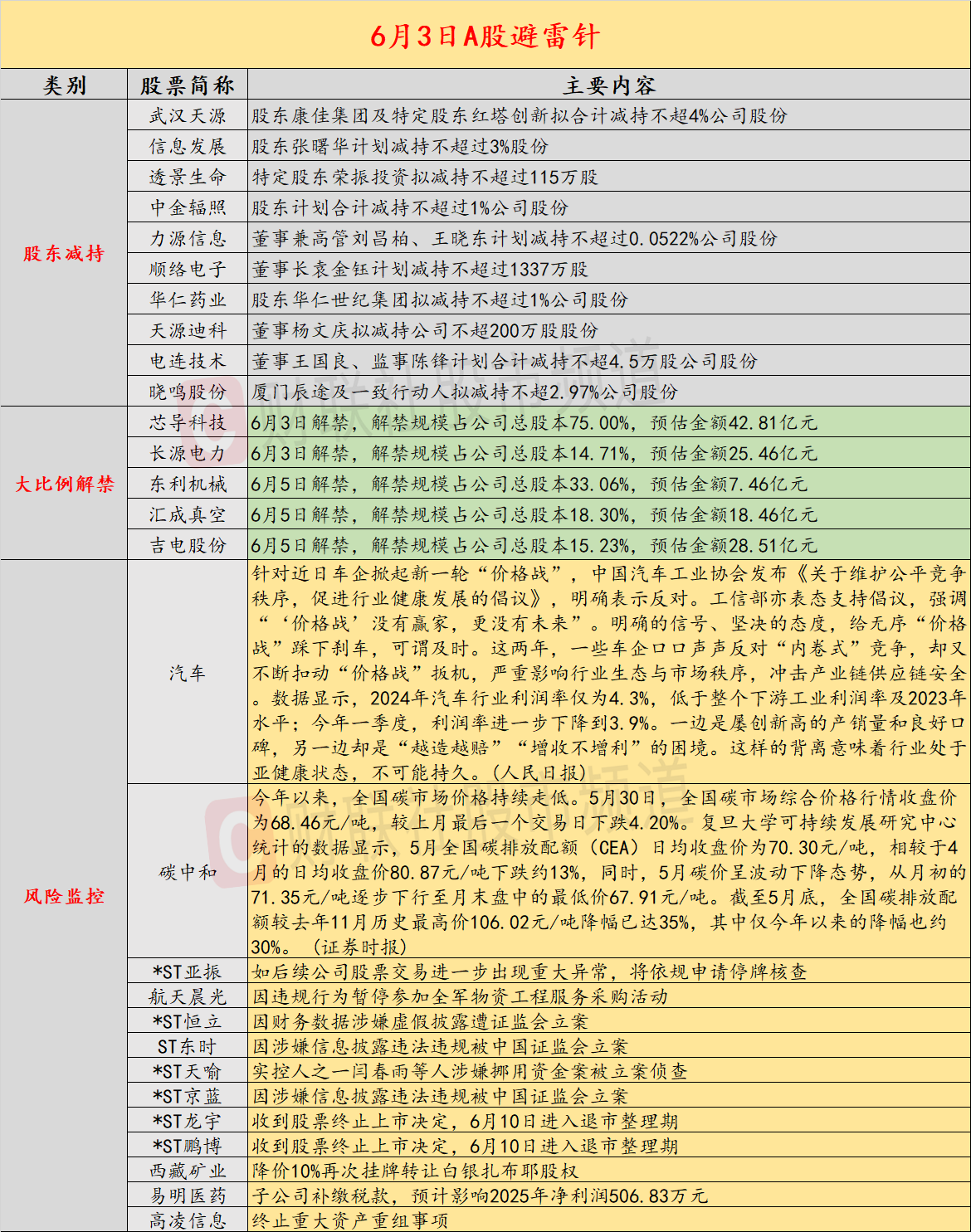 近日公告的A股拟减持的公司数量较之前有所增多,武汉天源股东康佳集团及特定股东红塔创新拟合计减持不超4%公司股份,信息发展股东张曙华计划减持不超过3%股份;芯导科技、东利机械将迎来超三成以上解禁;人民日报评论,新能源汽车决不能打价格战兴奋剂;*ST亚振公告,如后续公司股票交易进一步出现重大异常,将依规申请停牌核查;全国碳市场价格持续走低,已较最高价降逾三成;航天晨光因违规行为暂停参加全军物资工程服务采购活动;美宣布提高钢铝关税至50%。