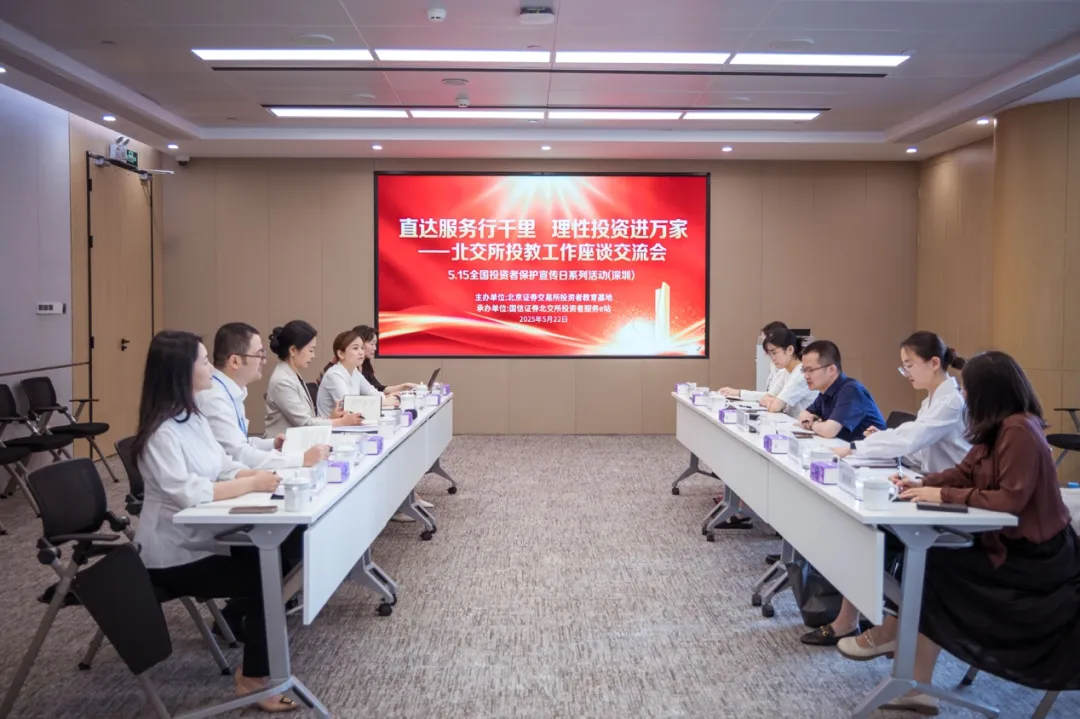 5月21日,北交所投教基地走进平安证券广州北交所投资者服务e站,充分听取一线工作人员对服务e站建设、北交所市场建设的意见建议。5月22日,北交所在国信证券深圳分公司北交所投资者服务e站召开“直达服务行千里 理性投资进万家”——北交所投教工作座谈交流会,邀请部分深圳辖区券商投教负责人共同探讨针对投资者需求分层分类开展北交所投教投服工作的优秀做法,收集对于北交所市场发展建设及投资者教育服务工作意见建议,进一步增强北交所投资者教育服务的精准性、有效性。
