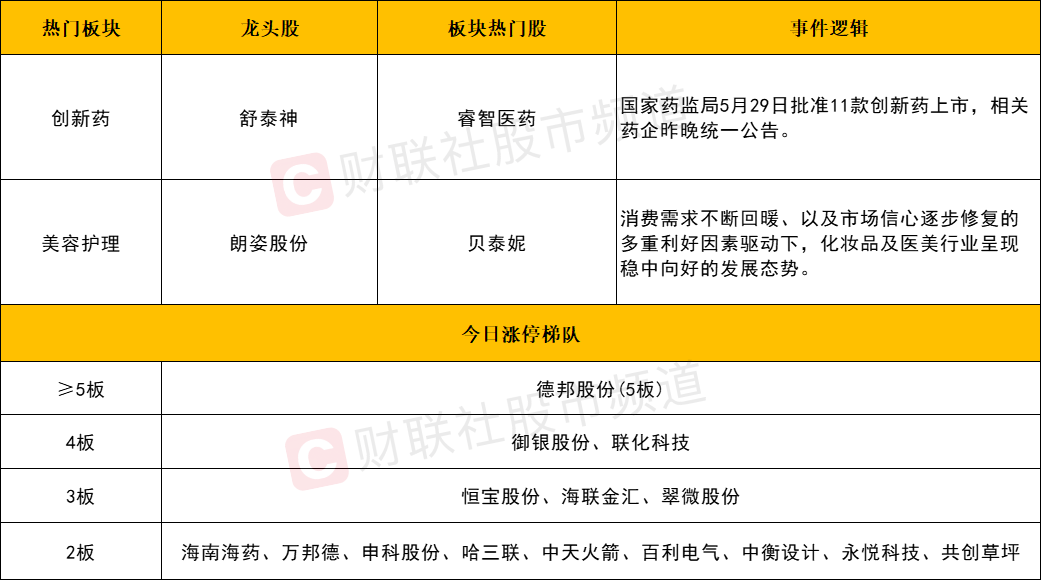 而连板股方向的热度同样明显回暖。德邦股份斩获5连板,御银股份、联化科技晋级4板,而均瑶健康也于午后上演“地天板”走出6天5板。不过,前期高位人气股的亏钱效应尚未完全消弭,如王子新材、长城电工、云内动力等个股今日仍以跌停报收。若后续上述个股也能够止跌修复的话,或将带动短线炒作情绪的进一步提升。
