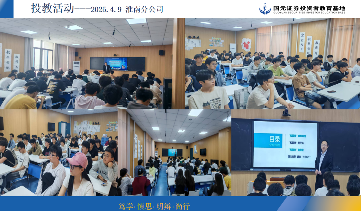 为深入贯彻落实中国证券业协会"投资者教育进百校"工作部署,2025年4月9日,国元证券投资者教育基地联合淮南分公司走进淮南师范学院金融与数字学院,开展了一场主题为"理性投资·远离非法校园贷"的专题投教活动。本次活动面向23级、24级金融工程专业101名学生,通过系统讲解、案例分析、互动问答等多种形式,深入揭示非法校园贷的危害,切实提升学生金融风险防范能力。