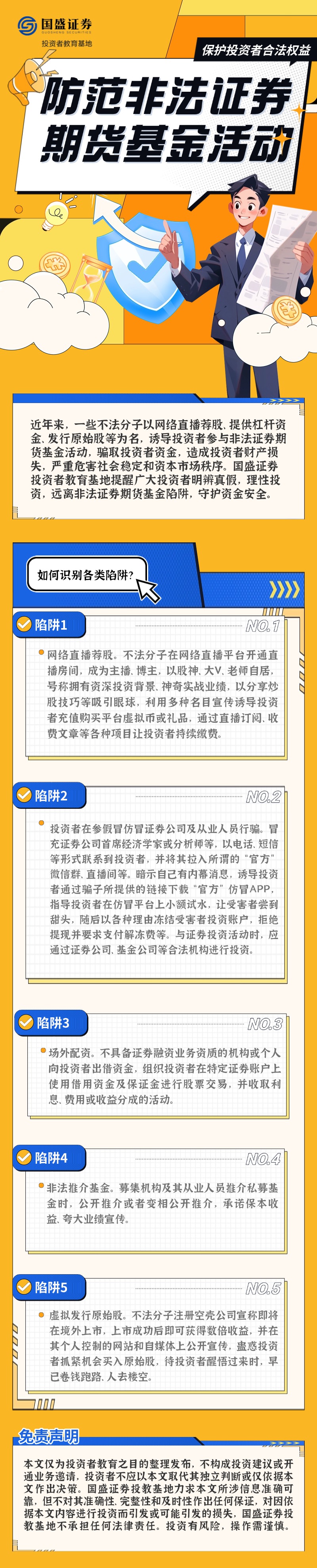 近年来,一些不法分子以网络直播荐股,提供杠杆资金、发行原始股等为名,诱导投资者参与非法证券期货基金活动,骗取投资者资金,造成投资者财产损失,严重危害社会稳定和资本市场秩序。国盛证券投资者教育基地提醒广大投资者明辨真假,理性投资,远离非法证券期货基金陷阱,守护资金安全。