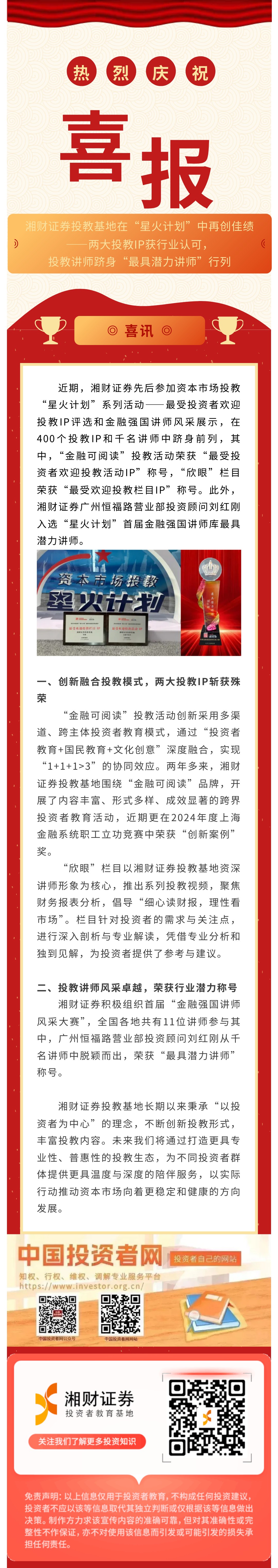 【喜报】湘财证券投教基地在“星火计划”中再创佳绩——两大投教IP获行业认可,投教讲师跻身“最具潜力讲师”行列