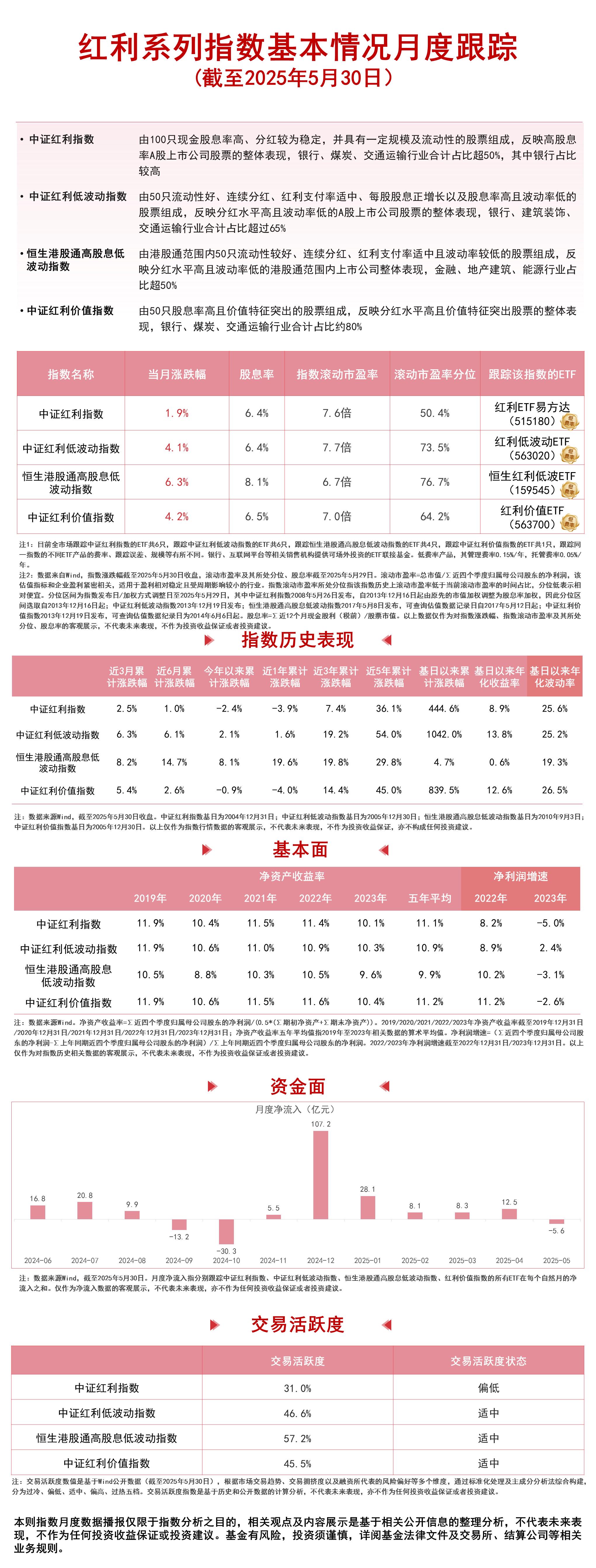 5月,恒生港股通高股息低波动指数上涨6.3%,中证红利价值指数上涨4.2%,中证红利低波动指数上涨4.1%,中证红利指数上涨1.9%。
