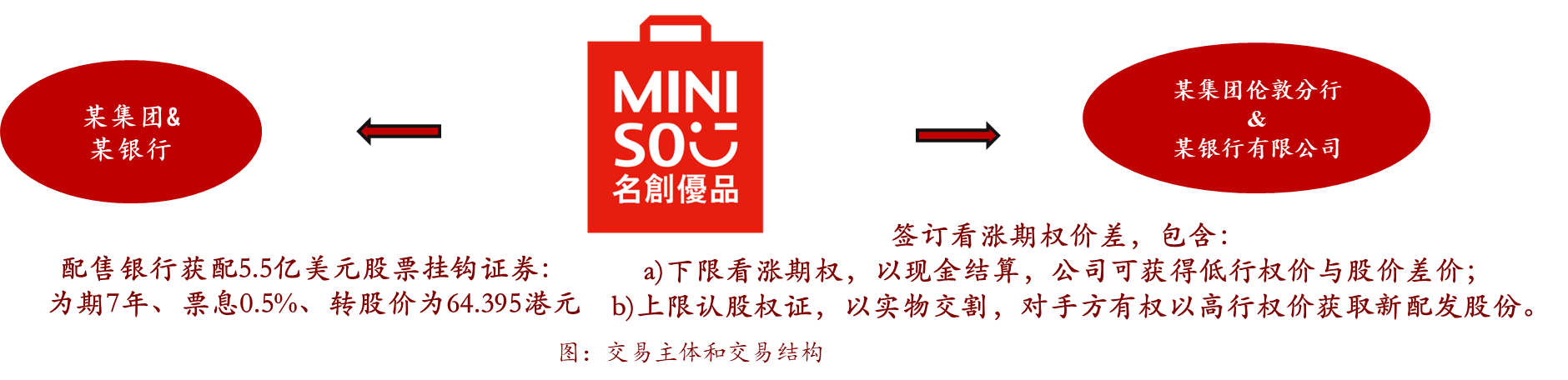 名创优品卖出挂钩其普通股、行权价为102.10港元的看涨期权,较股票挂钩证券发行协议日前五日平均收盘价每股48.28港元溢价111.47%。名创优品作为期权卖方,有义务以股份交割进行实物结算。某集团伦敦分行及某银行有限公司未来有权以固定价格(102.1港元)认购名创优品股份。若悉数行使,名创优品将发行6640.7万股(占已发行股份5.31%)。名创优品收取“上限认股权证”的期权费,抵消部分“下限看涨期权”付出的期权费,降低整体的融资成本,并将潜在股权稀释延迟至高股价水平。