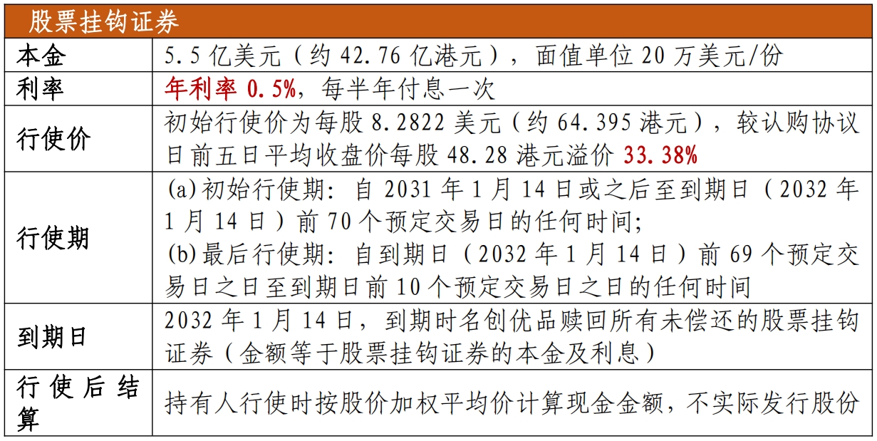 根据本次名创优品公告的发行文件,本次股票挂钩证券每份证券的面值为20万美元,该证券将于2032年1月14日到期,持有该证券的持有人可以获得如下权益: