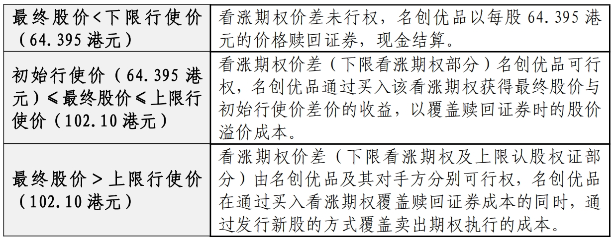 (2)股价高于64.395港元,名创优品行权,获得超过64.395港元的现金差额补偿。