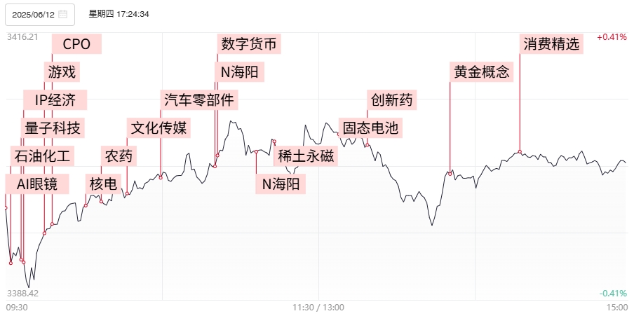 财联社6月13日电,市场全天窄幅震荡,三大指数涨跌不一。市场热点快速轮动,个股跌多涨少,全市场超2800只个股下跌。沪深两市全天成交额1.27万亿,较前日放量163亿。1)泡泡玛特旗下LABUBU系列产品火爆,知情人士称泡泡玛特年初已扩产能,但需求远超供应链反应速度。港股IP经济明星股泡泡玛特今早一度大涨5%, IP经济概念热度继续高烧不退,新北洋直接一字涨停实现连板晋级,带动北交所柏星龙以及两只创业板低位股奥雅股份、德艺文创等低位趋势股走出补涨加速实现封板,而星辉娱乐、创源股份、京华激光等此前领涨的高位人气股表现则相对逊色。2)近两个月,海外稀土金属价格持续走高,镝、铽等部分品种价格涨幅超200%,稀土永磁板块再度走出分歧转一致,北矿科技、华阳新材、宁波韵升实现连板晋级,英思特、大地熊等20厘米趋势票也向上展开加速。3)港股创新药企中国生物制药在第46届高盛全球医疗健康年会上透露,今年将至少有1个重量级的out-license交易落地,中国生物制药全天高开高走一度涨超20%,刺激创新药概念涨势再起,海思科、百济神州、益方生物等多股再创历史新高。4)此前有报道称蚂蚁集团将在中国香港和新加坡申请稳定币许可,蚂蚁对此向《科创板日报》回应称,相关通道开启后尽快提交申请。稳定币概念维持近期活跃态势,进而带动互联金融、多元金融等泛金融方向仍表现亮眼,南华期货反包涨停走出8天5板,兆日科技、瑞达期货、元隆雅图、东信和平等多股涨停,20CM趋势人气股雄帝科技续创阶段新高。