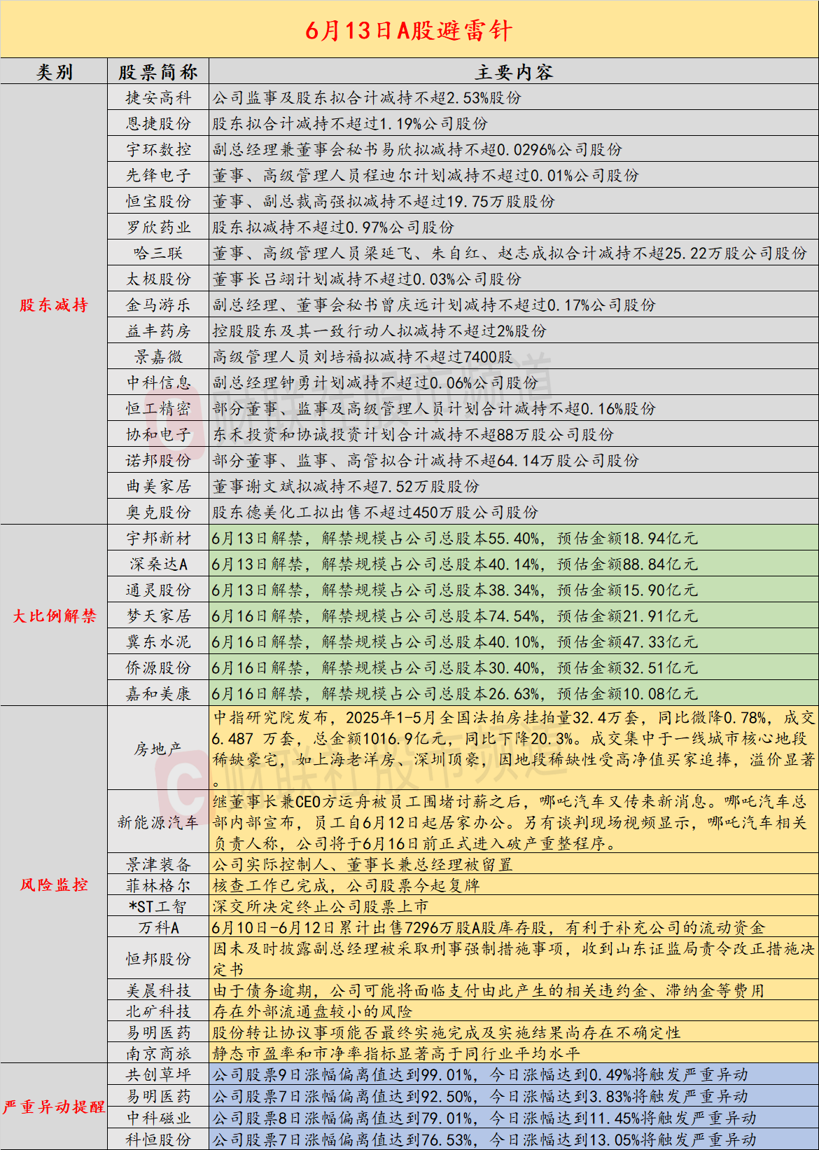 昨日公告的A股拟减持的公司数量较之前有所增多,捷安高科公司监事及股东拟合计减持不超2.53%股份;深桑达A、宇邦新材将迎来超四成以上解禁;2025年1-5月全国法拍房挂拍量32.4万套,总金额1016.9亿元,同比下降20.3%;景津装备公司实际控制人、董事长兼总经理被留置;哪吒汽车相关负责人称,公司将于6月16日前正式进入破产重整程序;菲林格尔核查工作已完成,公司股票今起复牌;美国宣布23日起对钢制家电加征关税,洗衣机冰箱在列。