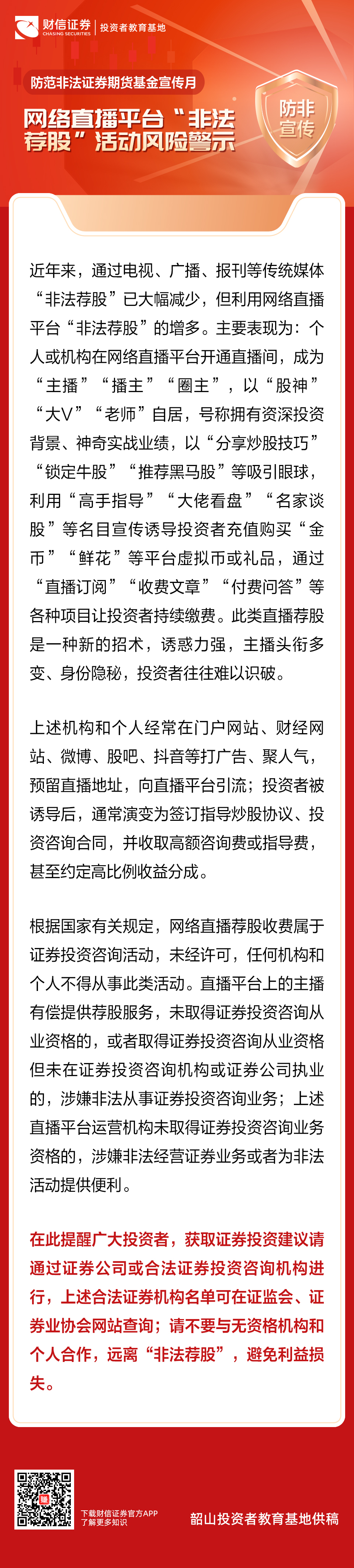 【免责声明:本栏目仅为投资者教育目的而发布,不构成任何投资建议。投资者不应以该等信息取代其独立判断或仅根据该等信息做出决策。财信证券投教基地力求所涉信息准确可靠,但对这些信息的准确性、完整性和及时性不作保证,亦不对因使用该等信息而引发的损失承担任何责任。】