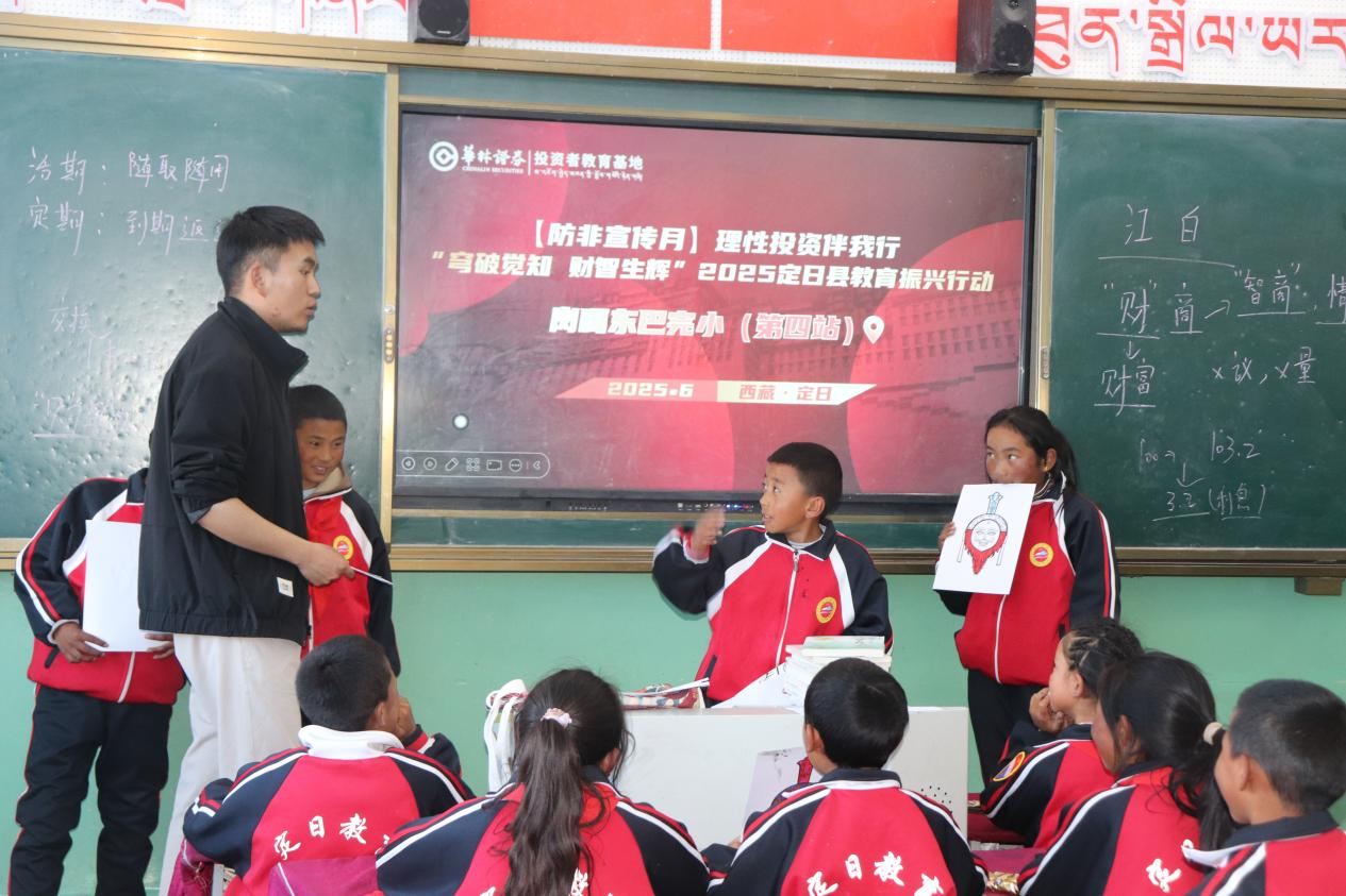 6月5日下午,华林证券投教基地在圆满完成扎果小学财商教育活动后,继续前往岗嘎东巴完小,为四年级2班的40多位同学带来了一场生动的财商启蒙课。本次系列活动以“送教入藏”为主题,通过专业财商教育与藏族传统文化的深度融合,在灾后重建的关键时期为当地师生送去知识与希望,充分体现了华林证券“雪域投教、情暖高原”的责任理念。