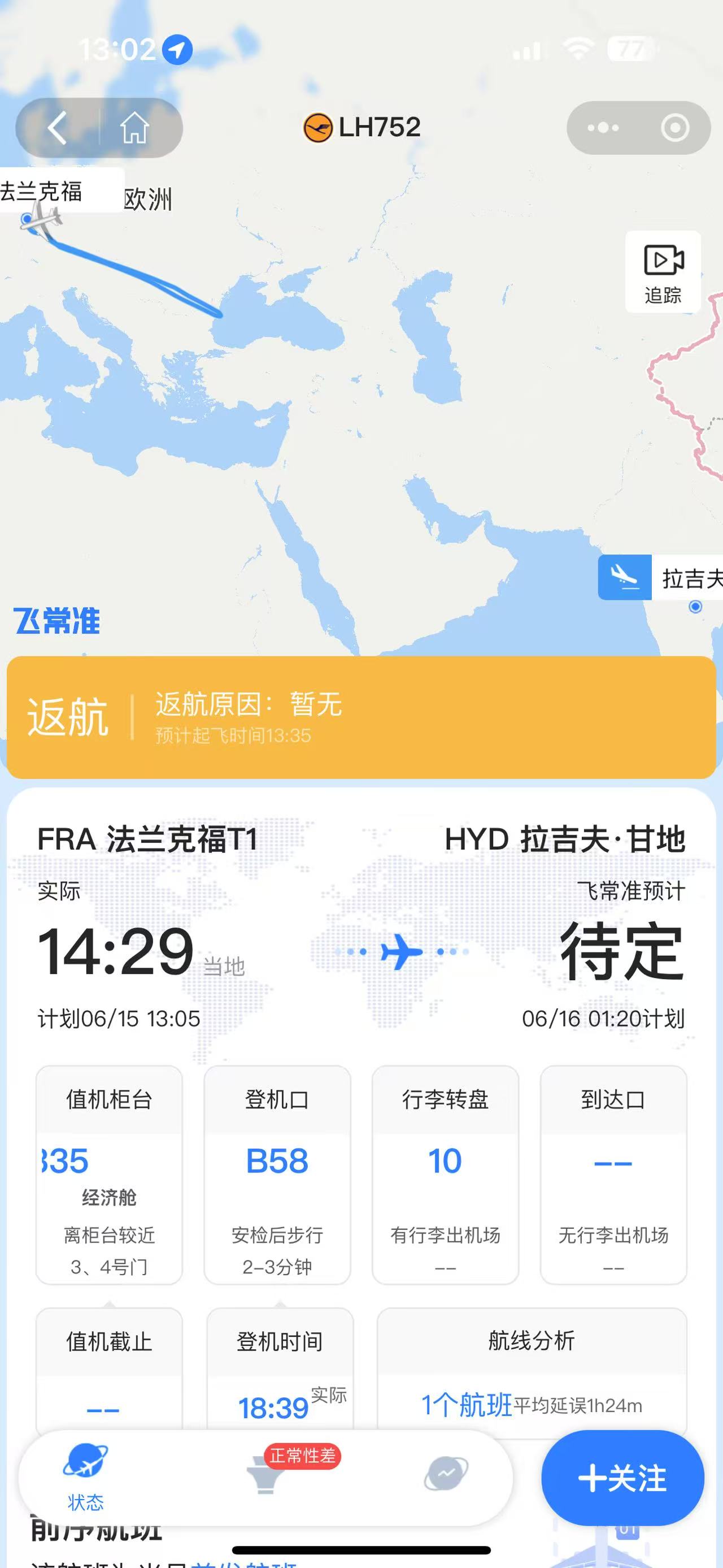 财联社6月16日电,据央视新闻报道,记者当地时间16日获悉,汉莎航空从德国法兰克福起飞的LH752次航班原计划于16日凌晨抵达印度海得拉巴,但由于该机场工作人员称“收到炸弹威胁信息”,该航班未获准降落被迫返航。