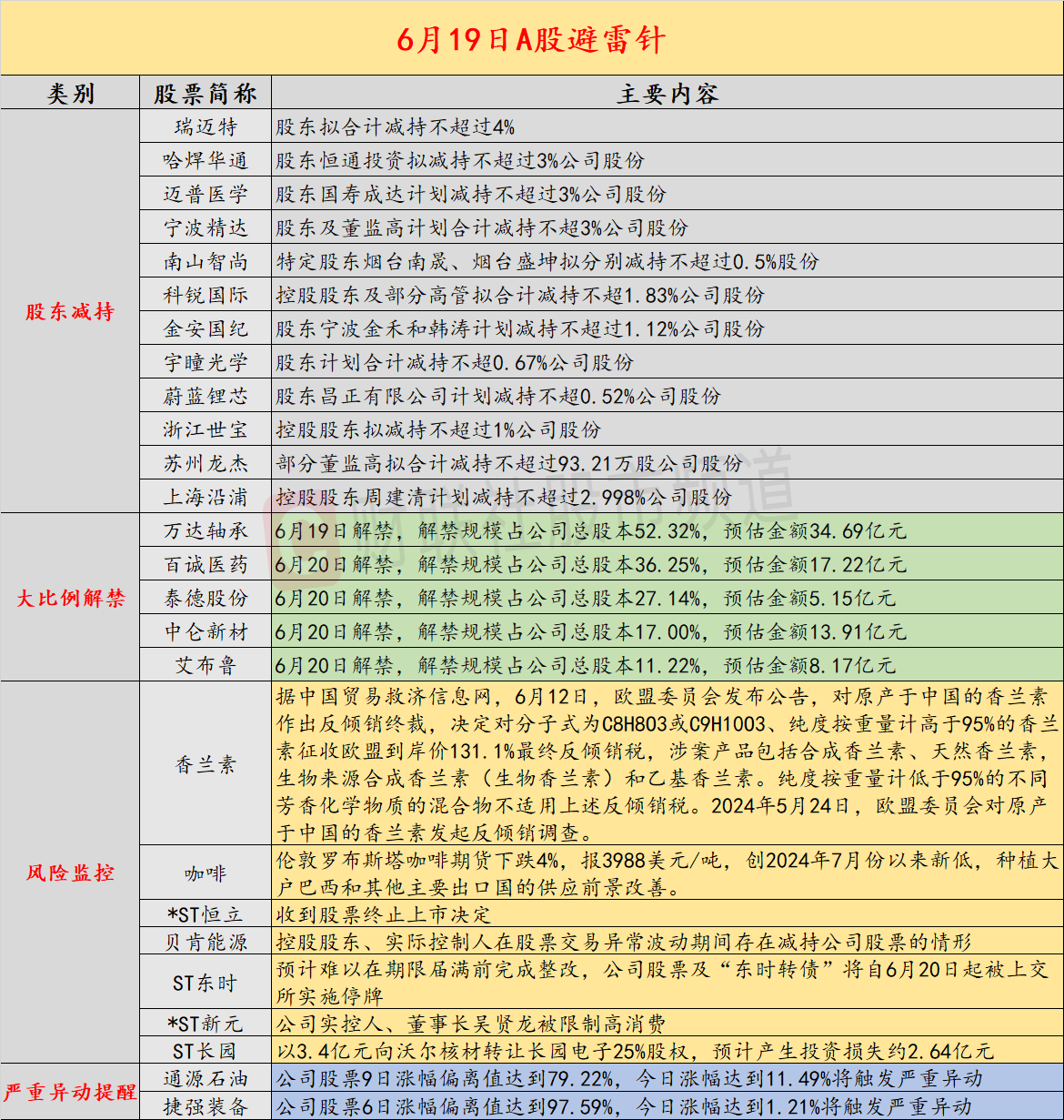 昨日公告的A股拟减持的公司数量较之前有所增多,瑞迈特股东拟合计减持不超过4%,哈焊华通股东恒通投资拟减持不超过3%公司股份;万达轴承、百诚医药将迎来超三成以上解禁;欧盟对华香兰素作出反倾销终裁,决定征收131.1%反倾销税;*ST恒立收到股票终止上市决定;2024年全国公共采购总额为45万亿元,政府采购规模“三连降”;4连板贝肯能源公告,控股股东、实际控制人在股票交易异常波动期间存在减持公司股票的情形;美联储维持利率不变,美股三大指数收盘涨跌不一。