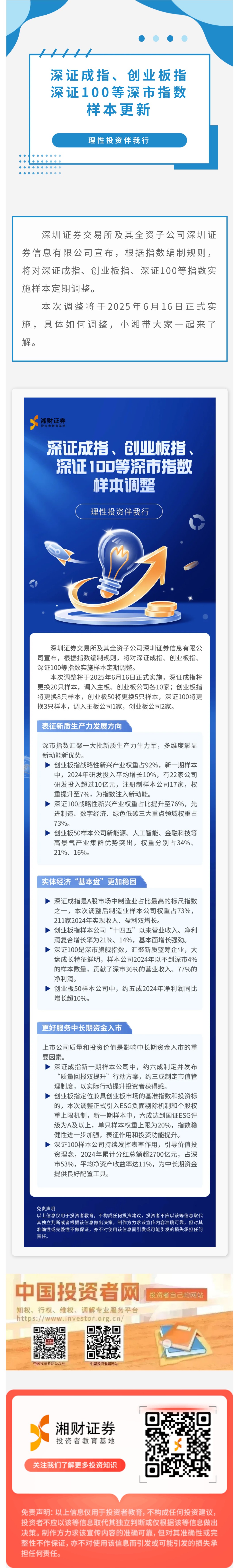【理性投资伴我行 | 小湘科普】深证成指、创业板指、深证100指数样本调整,6月16日正式实施