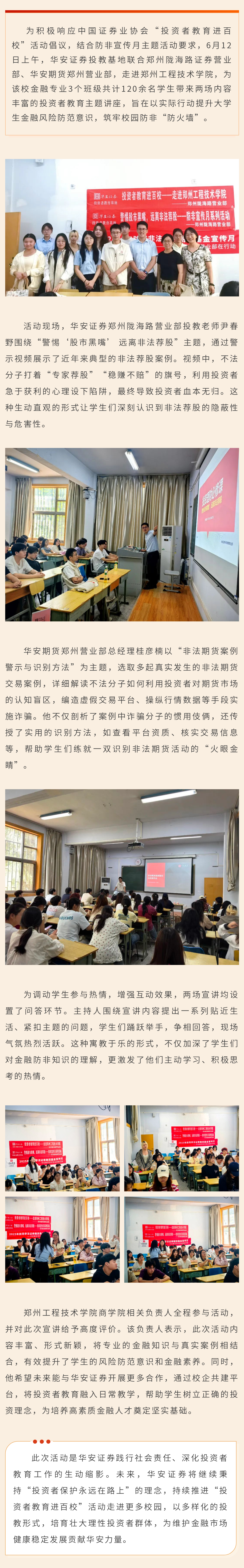 为积极响应中国证券业协会“投资者教育进百校”活动倡议,结合防非宣传月主题活动要求,6月12日上午,华安证券投教基地联合郑州陇海路证券营业部、华安期货郑州营业部,走进郑州工程技术学院,举办了两场投资者教育主题讲座,旨在以实际行动提升大学生金融风险防范意识,筑牢校园防非“防火墙”。