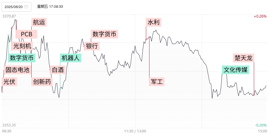 财联社6月23日电,市场全天震荡走低,创业板指领跌。个股跌多涨少,全市场超3600只个股下跌。沪深两市全天成交额1.07万亿,缩量1829亿。1)近期,固态电池设备端催化不断,多家头部大厂公布了固态电池的量产时间表。固态电池概念继续站上风口,诺德股份、湘潭电化、海科新源实现连板晋级打开整个板块高度空间,进而带动低位的科恒股份等多股批量补涨上板。2)克拉克森数据显示,从海湾地区到中国的VLCC的租用价格,从19998美元/日飙升至47609美元/日。航运板块逆势展开补涨,但除去宁波海运、兴通股份涨停外,其余多数品种日内呈现冲高回落。3)半导体产业链延续反弹势头,其中光刻机方向领涨,强力新材、光力科技等多股涨停。在本土晶圆厂先进制程扩产加速的大趋势下,相关的设备以及材料端仍具备较大增量。而此前主导科技股涨势的算力硬件端今日展开分歧,中京电子晋级3连板的同时,新易盛、胜宏科技等此前创出历史或阶段新高的机构重仓品种出现资金高位兑现的苗头。4)6月19日,据京东相关人士透露,京东方面期望今年第四季度初获得稳定币牌照,并推出基于公链发行的京东稳定币。稳定币概念持续分化,协鑫能科、金时科技、霍普股份等高位股补跌的同时,楚天龙以地天板实现反包,华铭智能、新国都、高伟达、信息发展等低位趋势股展开补涨。