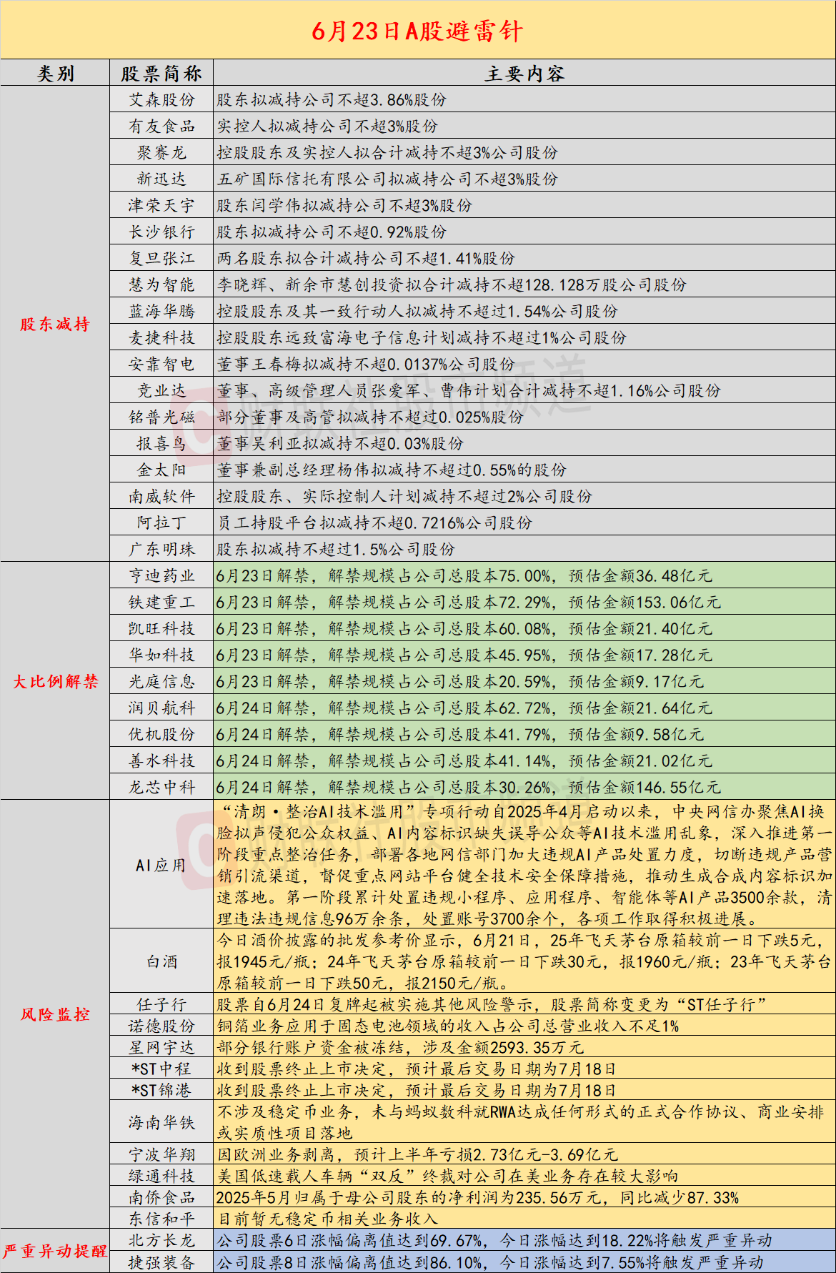 近日公告的A股拟减持的公司数量较之前有所增多,艾森股份股东拟减持公司不超3.86%股份,有友食品实控人拟减持公司不超3%股份;亨迪药业、铁建重工将迎来超七成以上解禁;财政部数据显示,1—5月全国一般公共预算收入96623亿元,同比下降0.3%;任子行股票自6月24日复牌起被实施其他风险警示,股票简称变更为“ST任子行”;网信办整治AI滥用,3500余款违规AI产品被处置;4连板诺德股份公告,铜箔业务应用于固态电池领域的收入占公司总营业收入不足1%;美军轰炸伊朗3处核设施。