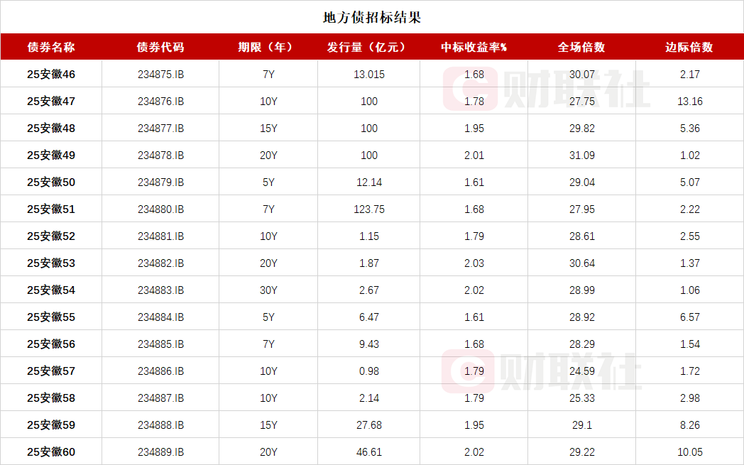 财联社6月23电,安徽省政府十六期地方债已招标结束,投标倍数均在24倍之上,具体中标信息如下: