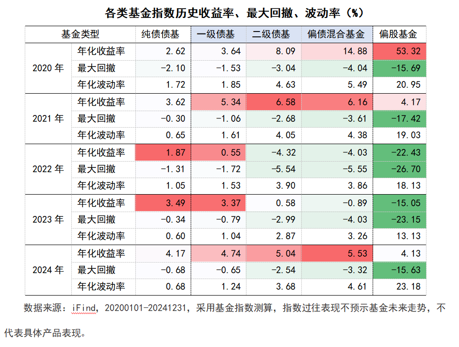 股市波动较大时,这类基金因投资组合中有债券资产打底,债券表现起到了防御作用,回撤幅度明显低于偏股基金,如2022年、2023年。