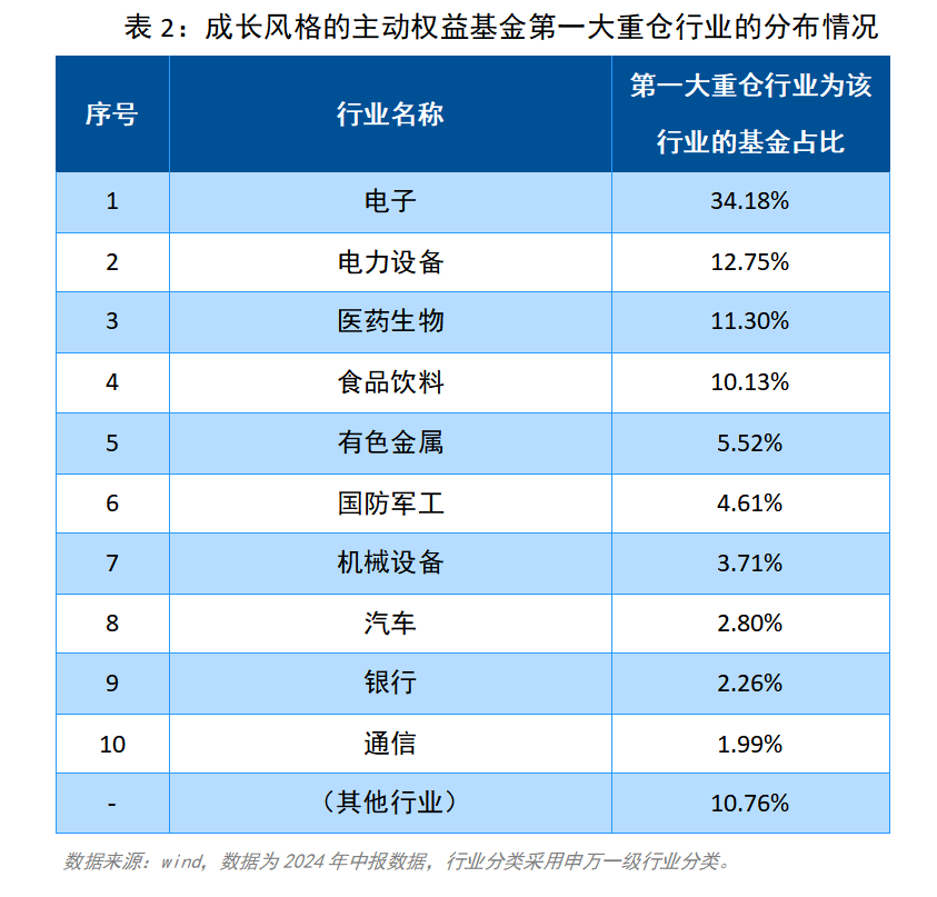 下表展示了成长风格的主动权益基金第一大重仓行业的分布情况,整体上看,成长风格基金重仓的行业包括电子、电力设备、医药生物等。
