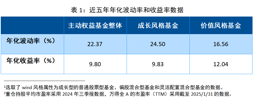 而在风险收益特征方面,下表展示了近五年成长、价值风格的主动权益基金的年化波动率和收益率数据。整体来看,成长风格基金的年化波动率明显高于价值风格的基金,说明其风险水平整体高于价值风格基金。
