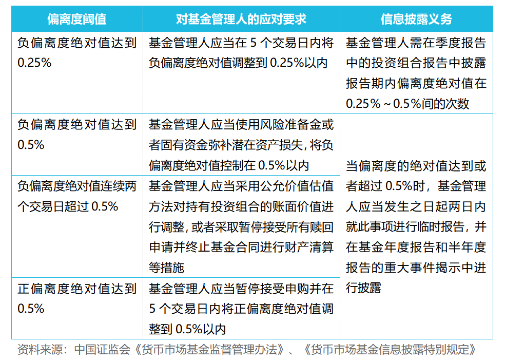为避免账面价值与实际价格的差异过大,根据《货币市场基金监督管理办法》,货币基金需每个估值日计算偏离度,若偏离度绝对值超过某一水平,基金管理人应采取对应的措施来应对并履行信息披露义务,具体可以查阅下面的表格。