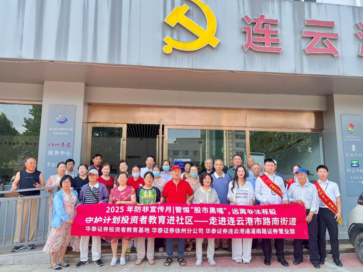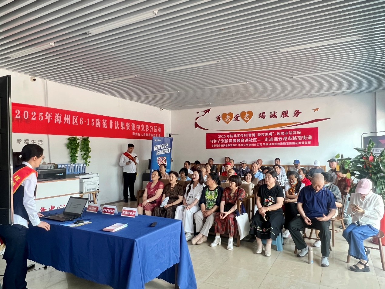 为推动投资者保护服务平等惠及中老年人,提高中老年投资者风险防范意识和自我保护能力,共同守护老百姓的“钱袋子”,华泰证券投教基地联合徐州分公司及连云港通灌南路证券营业部以防非宣传月为契机,于6月17日开展防非教育宣传走进连云港市海州区路南街道专场活动,为社区居民带来了投保防非主题讲座。