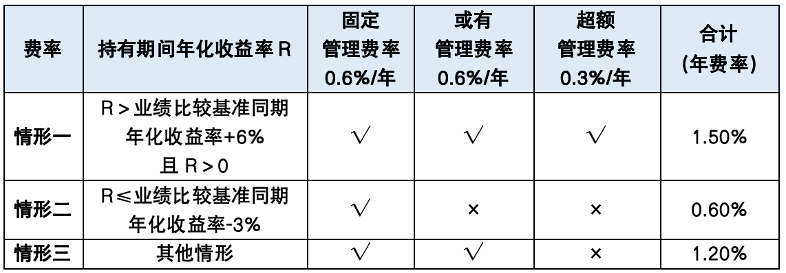 情形二:持有期间基金年化收益率跑输业绩比较基准3%及以上,仅收取0.6%/年的固定管理费。