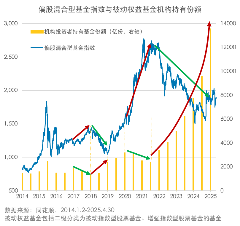 我们再结合半年报、年报披露的机构、个人投资者持有被动权益基金的份额情况进行进一步分析,可以看出,在市场整体上涨阶段,机构整体持有份额不断下降,而在市场持续下跌阶段,持有份额则持续“逆市”增长。可见,机构投资者在市场低迷阶段,比较坚定地持续开展了逆向投资。